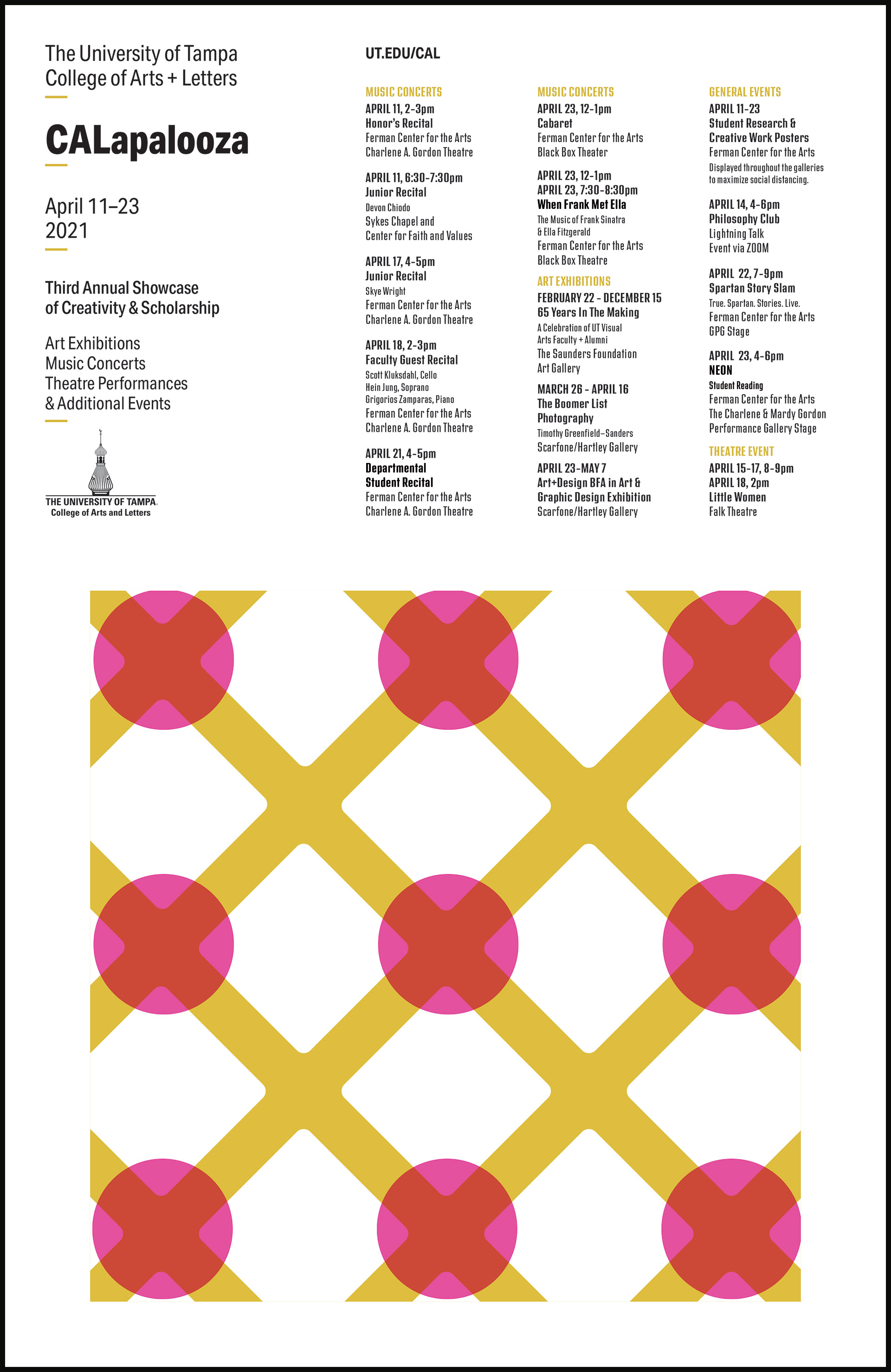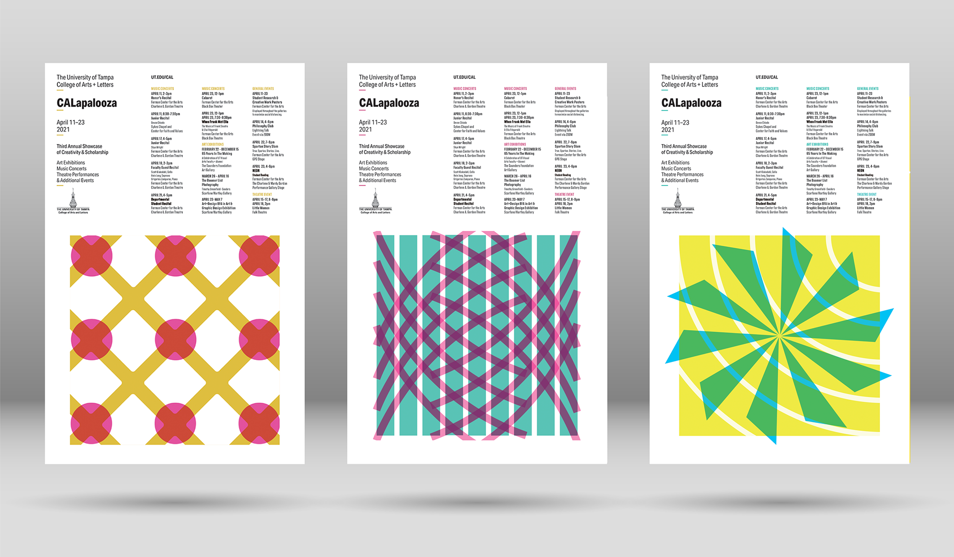 The posters are for a University event titled CALapalooza which is a week-long celebration of the arts including gallery shows, live theatre and concerts. Inspiration for the design motifs is from the places where events were held including the Falk Theatre, the on-campus Sykes Chapel and flooring of the new Ferman Center for the Arts.